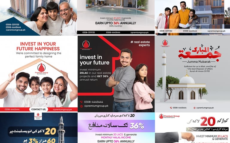 Social Media Designs: Sale Socially developed visually captivating and on-brand social media designs for Premium Group. Each post, story, and banner was crafted to reflect the brand’s upscale identity, showcasing their luxury apartments, modern penthouses, and premium commercial units. We ensured that every design highlighted key selling points—such as prime locations, state-of-the-art amenities, and flexible payment plans—to drive increased interaction across platforms.